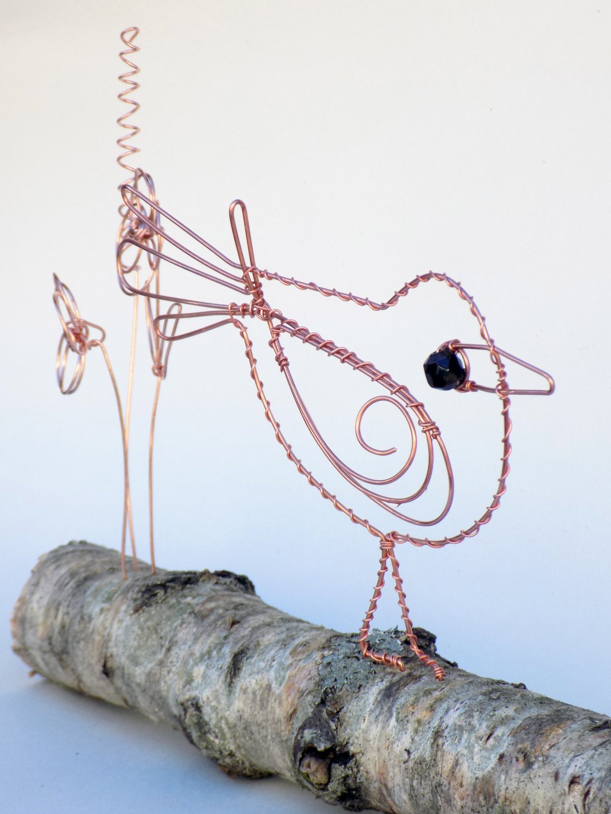 These gorgeous little birds are a joy to make. You can choose from copper or iron wire. Copper is great for indoors or outside. Iron wire will rust if outside, but these little birds also look great rusty.